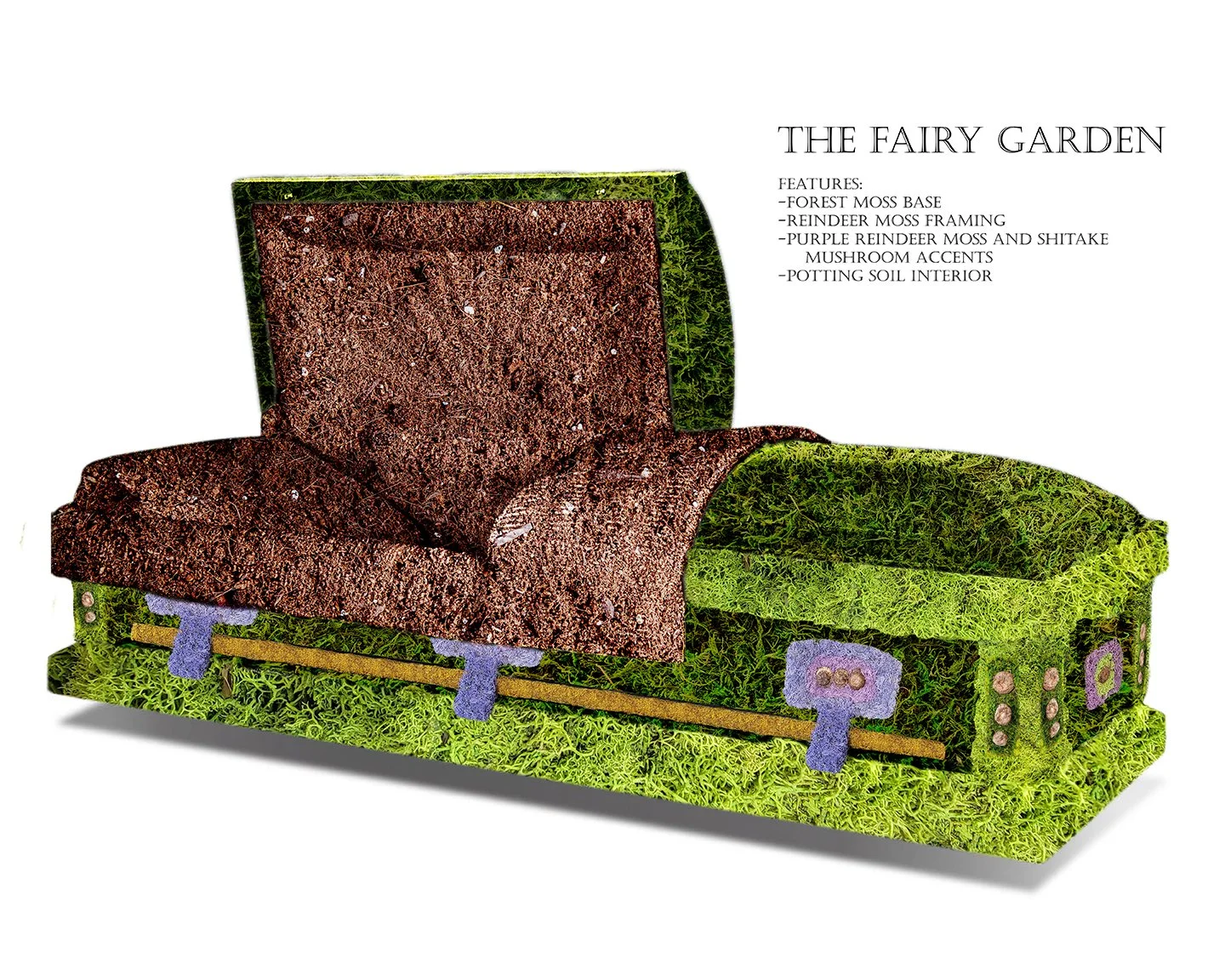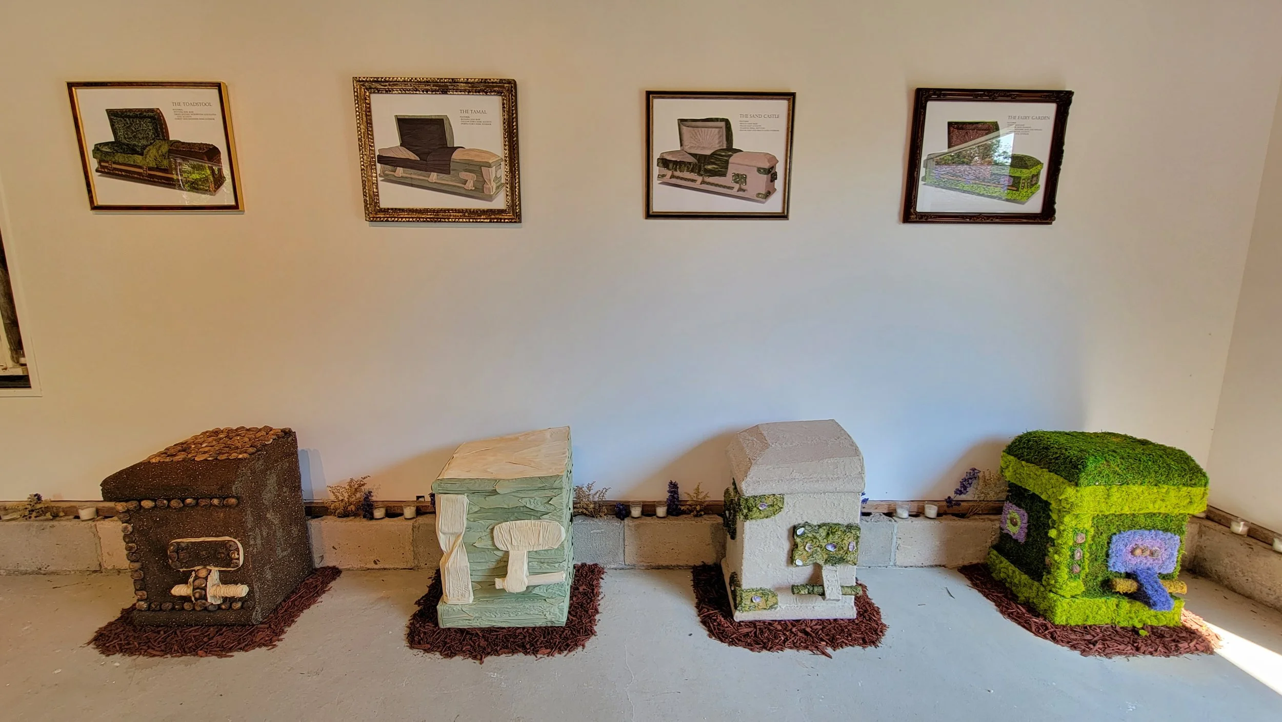 Aquí Descansamos began as a living cemetery composed of floral sculptures which mirrored the shapes of common grave markers. In contrast to the somber, grey-stone visuals of conventional cemeteries, these alternate memorials highlight color, growth, decomposition, and renewal, offering a space to celebrate life’s vibrancy while acknowledging its temporary and ever-changing nature. An expansion on the series evolved to incorporate burial vessels including caskets, urns, and shrouds, all similarly crafted from organic, ephemeral materials such as moss, soap, sand, seaweed, and beeswax. When installed, these vessels come together in the form of a funeral showroom, creating a familiar yet novel environment in which to consider end-of-life planning as an opportunity for empowerment. No matter how we choose to honor the dead, we will all face loss one day and find ourselves seeking comfort in ritual and memorialization. In reminding us of our universal experience of grief, Aquí Descansamos honors the dead while providing space to imagine a future where we rest alongside them. How we wish to memorialize our loved ones, and ourselves in the future, is entirely up to us.